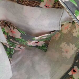 Tote bag. Gray background with pink flowers, green leaves, and some animal print patterns throughout. Silver zipper with the PINK logo that partly covers the open top of the bag. Inside the bag is a pocket. One side of the bag has a faux leather patch with the PINK logo.