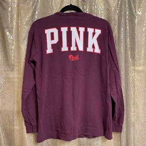 Cute long sleeve top from PINK, has logo on the front and large logo in the back across the shoulders. Gently used; does have some wash wear but not bad. Oversized. Smoke and pet free home. Size S, crosslisted.