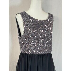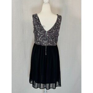 This enchanting mini dress features a glittering sequin bodice that exudes elegance, contrasted by a flowing black chiffon skirt. Perfectly sleeveless for a chic, minimalist look, it includes a zipper back for a touch of modernity. The waistband subtly adds structure, making it an excellent choice for semi-formal gatherings or lively evening outings.