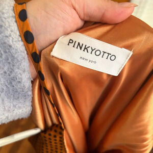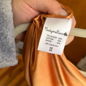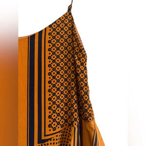 Pre owned excellent condition. Worn once or twice. Very unique navy blue and orange dress with ruffles and asymmetrical hem. Size tag was removed but I believe this is a large.