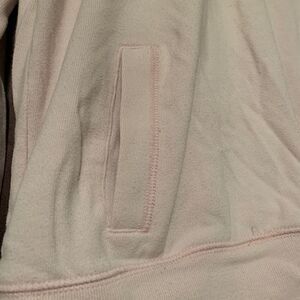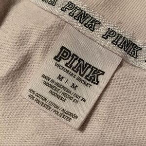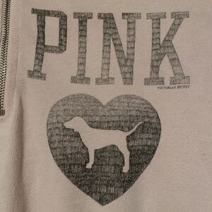 Light pink, 1/4 zip sweatshirt. Silver zipper with long sleeves. Black PINK logo on front left chest. Pockets in the front. Light discoloration from use on the edges.