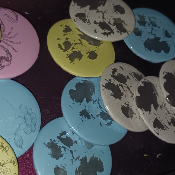 buttons, pawprints and more printed designs with plastic backing and metal tops