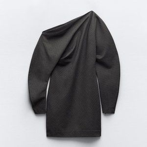 Mini dress with fluid neckline. Asymmetrical voluminous wide long sleeves. Side hidden in-seam zip closure.