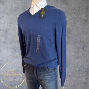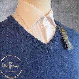 PIOMBO Mens Sweater XXL Extra Fine 100% Merino Wool V Neck Sweater Navy Blue