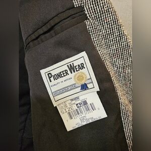 This Pioneer Wear wool blend blazer is a stylish addition to any vintage clothing collection. The black tailored jacket from the 1970s is made with high-quality material that will keep you warm and comfortable. The regular length blazer has a classic look that can be dressed up or down for any occasion. Perfect for the fashion-conscious man who wants to stand out from the crowd.