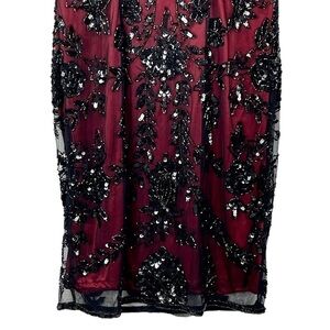 DETAIL: SCOOP NECK AND BACK. CAP SLEEVE. SEQUIN AND BEAD MESH OVERLAY. INVISIBLE ZIPPER DOWN SIDE.