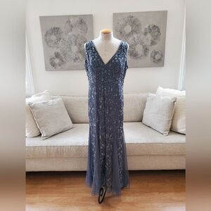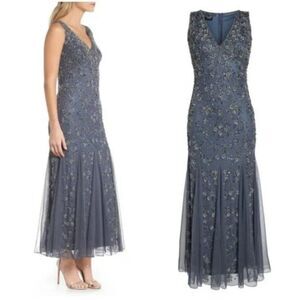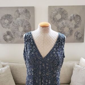 AN102 (tags: formal, wedding, evening, mother of the bride, bridesmaid, black tie, white tie, prom, cocktail, maxi, midi, long, full length, sleeveless, tank, v-neck, beaded, embellished, sparkly, sequin, mesh, plus size, steel blue, gray blue]