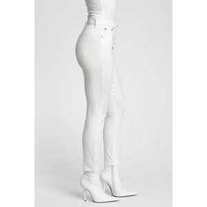 The Aline is a high rise skinny jean. This style in the Winter White wash features an exposed button on a white denim.