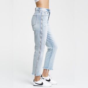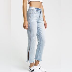 Grungy cool pistola charli jeans high Rise waist with cropped straight leg. Features a light wash with distressed accents and functional side zippers for versatile styling. Completed with button fly closure and a raw frayed hem