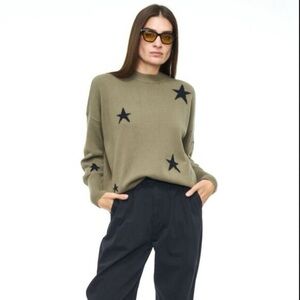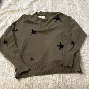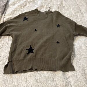 Chic olive sweater with bold black star design. Perfect for casual wear.