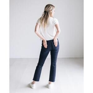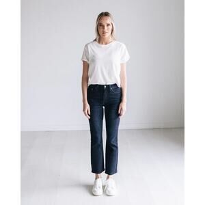 The Lennon is our signature high-rise cropped boot cut, and this time, it's here in a dark wash with a little bit of stretch. It hugs from waist to knee and flares out at the ankle, and with a finished hem and no distressing, it is the perfect pair of denim to dress up any look.