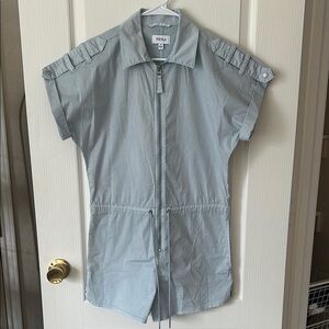 Chic sky blue romper by Pistola. Features zip closure and adjustable waist tie.