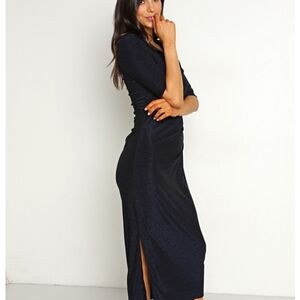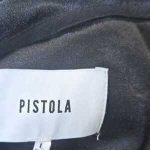 This black sheath dress by Pistola features a classic V-neck and short sleeves, perfect for casual or work settings. The buttoned, tie-front design adds a touch of elegance, while the polo collar enhances its sophisticated appeal.