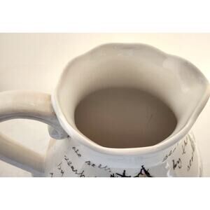 Pretty large pitcher by Maxcera. It is titled "Stamp Seahorse". The design is of seahorses, sea shells, as well as script writing and stamp art motif. It is a light cream color. It would be great as a pitcher, flower vase or shelf decor. It holds 10 cups. There are some rough spots on the top rim, but nothing that takes away from this nice pitcher.