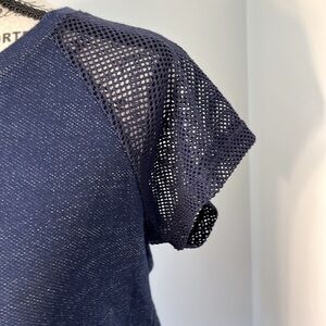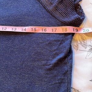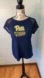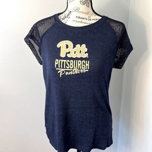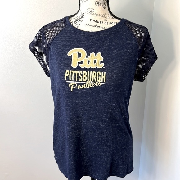This Pitt tee shirt is available in size medium. The fabric color is navy blue with white speckles throughout. The sleeves are .25 length in a mesh fabric style. Pitt-Pittsburgh Panthers is across the front of the shirt. The length of the shirt is 25”. Fabric content is polyester/spandex for easy wash and dry. This tee was made in the USA. Item is in very good pre owned condition and comes from a smoke free environment.