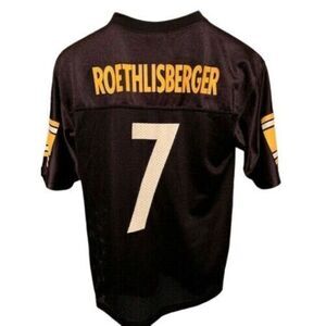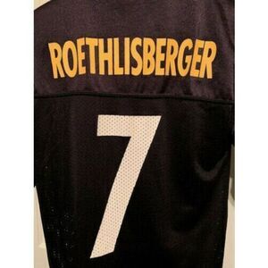 PITTSBURGH STEELERS BEN ROETHLISBERGER SIZE YOUTH LARGE 14-16 REEBOK JERSEY. 19" ARMPIT TO ARMPIT, 27" LONG. ABOUT 5" OF ONE LAYER STITCHING IS MISSING FROM RIGHT SLEEVE (THERE IS STILL A SINGLE STITCHING.) JERSEY IS IN GOOD CONDITION WITH NO TEARS, STAINS, ETC.