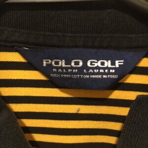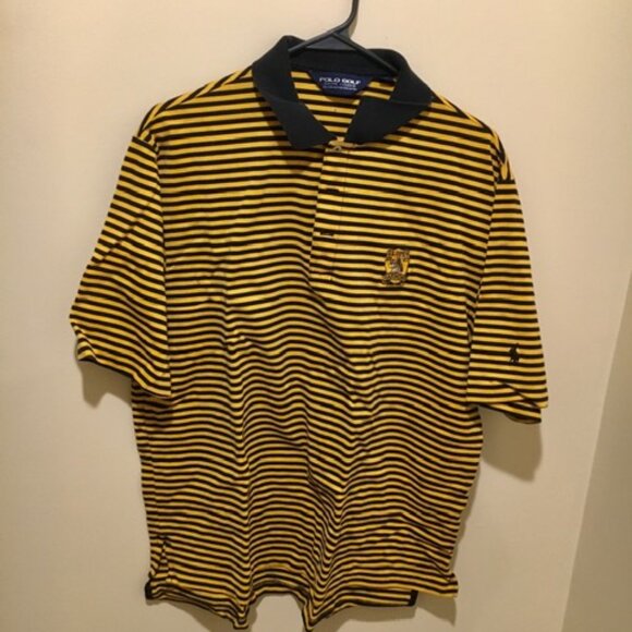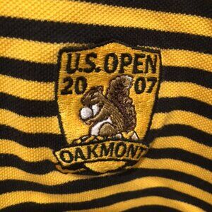 This was a huge seller inside the merch tent at the '07 U.S. Golf Open at Oakmont. It's designed in the black-and-gold colors of Pittsburgh's three pro sports teams and was produced only for sale at the tournament. It's a legitimate size Large, measuring 24.5" from pit to pit and 31" from top to tail. There's a black-and-gold Oakmont 2007 Open logo on the left breast and an all-black version of RL's polo pony logo on the left sleeve. Since this is a Polo Golf product, the sleeves are happily un-elasticized at the cuffs. I'd rate the condition as VG+. It's been worn a few times, but still looks sharp and unfaded without stains or snags. The '07 Open was won by Argentinian Angel Cabrera by one shot over both Tiger Woods and local favorite Jim Furyk.