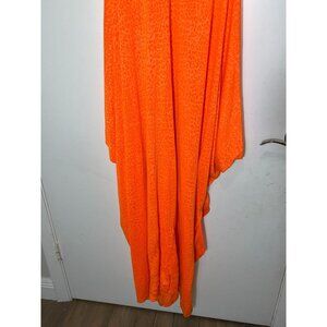 This vibrant orange dress features an asymmetrical cut and textured pattern. Ideal for adding a pop of color to your wardrobe.