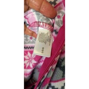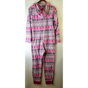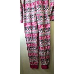 This is a cozy and colorful Plush one piece footie pajama for women in size M. It features a festive Christmas and holiday theme with a tribal and peasant design. The pajama has long sleeves, a round neck, and a zip closure for easy wear. Made of polyester fleece, it is lightweight and perfect for winter and fall seasons. The garment is machine washable and has animal print accents. PTP 19 in. Length 58 in. Has a stain on the back.