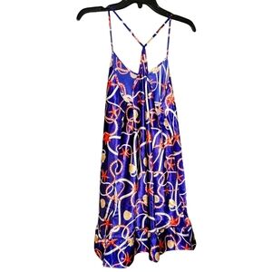 Stylish dress with a vibrant pattern. Features a unique strappy back. Perfect for a night out.