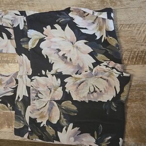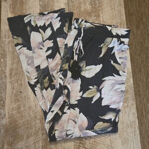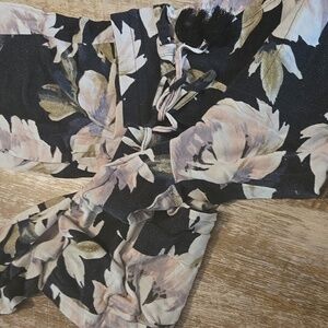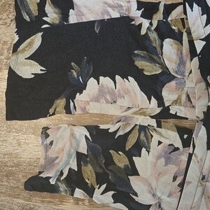 worn and loved. perfect for something to throw on to be comfy in. tried to show the worn in pictures. stretchy and has a tie at waist. ties has fringe at the ends