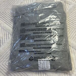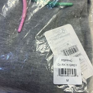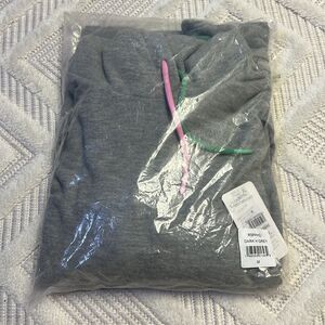 Get cozy in this matching grey hoodie with pink and green contrast cords and striped cuffs. Perfect for lounging in style.