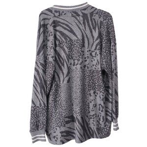 PJ Salvage Cardigan Leopard Grey Collegiate Collar Stripe Oversize Long Sleeve Button Up, size medium. This PJ Salvage grey leopard print cardigan is a lightweight knit in a gray neutral tone. It has a university or collegiate academia vibe with a Y2k twist and deep vee.