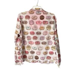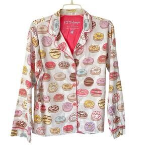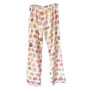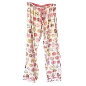 P.J. Salvage Cotton Doughnut Matching Pajama Set size large White Pink preloved with minor wear. Top measurements laying flat chest 23 inches across and length 25 1/2 inches long- pants waist elastic 14 inches across (drawstring is a bit weathered/faded) and inseam 29 inches long and rise 20 1/2 inches