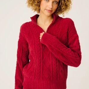 Dreamy-soft and lounge-ready, this chenille quarter-zip is the layer you’ll reach for on slow mornings and cozy nights. The deep wine-toned knit has a classic cable pattern and a plush, velvety touch you’ll want to live in. A relaxed fit, long sleeves, and an easy half-zip neckline make it perfect for layering over sleepwear or wearing solo while curled up with a good book.