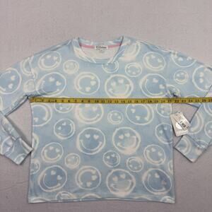 lounge top, pajama shirt, smiley top, light sky, heart eyes, cozy top, long sleeve, sleepwear, womens small, nwt, graphic top, tie dye, loungewear, comfy shirt