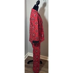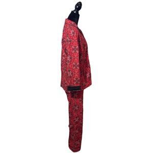 The PJ Salvage Pajama in a Bandanna print is a cozy and comfortable long sleeve pajama set made from 100% cotton flannel. Featuring a collared neckline with a button and drawstring closure, this Western-themed set is perfect for the winter and fall seasons. The red, black, and white color scheme adds a festive touch, while the accents of buttons and contrasting inner cuffs add a stylish detail. With a size M and a regular fit, this pajama set is ideal for women looking for a cozy and comfortable night's sleep.
