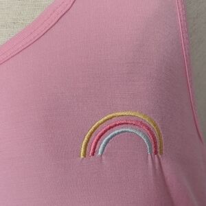 Scoop neck. Sleeveless. Racer back. Banded trim. Curved hem. Embroidered three band rainbow over heart on pink at front. Horizontal striped pattern at back.