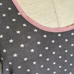 Soft, lightweight material. Scoop neck. Racerback. Sleeveless. Banded trim (pink). Curved hem. All-over mini star print in white on charcoal grey background.