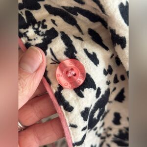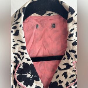 Classic button-down pajama top by PJ Salvage in 100% cotton. Features a unique black floral leopard print on a beige base, accented with pink piping. Soft and breathable—perfect for lounging or sleep. MSRP approx. $68.