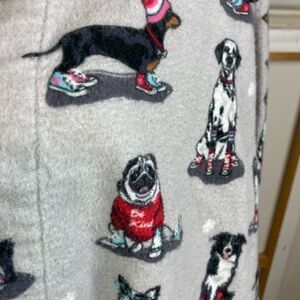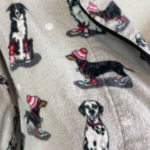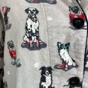 Really cute and cozy oversized thick soft cotton pj top. Print has adorable dog and cats in winter wear frolicking. Black piping. Nice patch style front pockets. Black buttons have brand name. No wear or flaws. Pugs, Dalmatians , daschunds, border collies, etc. Top only. Like new. Pit to pit 25” shoulder to hem 27” front 28” back. Small side vents.