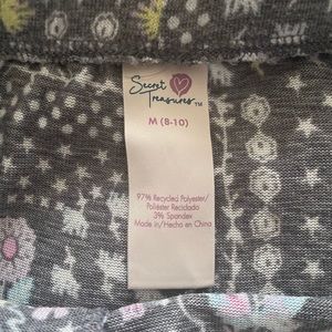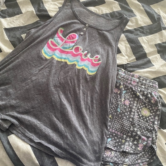 Shorts are a medium and top is a large - material is very soft. Hardly ever worn. Love decal on the shirt is sequence.