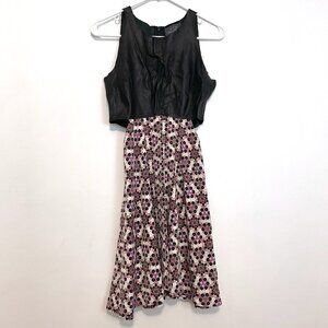 ◇ NO SIZE TAG - see measurements (sizes listed are an estimate, not a guarantee). Solid black leather upper // cream ivory / fuchsia and/or magenta pink ish purple ish / black / lime green / periwinkle purple ish blue ish / multi multicolor geo geometric print mandala print ish lower. Mixed media mixed material. Cutout waist details. High low hi-lo hem. Back zip zipper. Lined on skirt portion. Round neck ish and sleeveless. Very short mini length - mini length (varies). Fit & flare dress / skater dress
