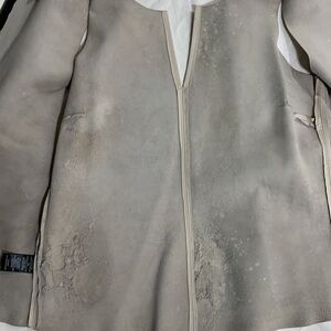 Very good gently used condition on outside but inside is a suede and in several areas has been rubbed off (peeling) from trying on I suppose. The wear does not effect the outside of garment and is not seen, also you can see the stitching from the label at back of neck