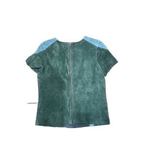 This beautiful blouse by PJK Patterson is a must-have for any fashion-forward woman. The colorblock pattern in shades of green is eye-catching and the cropped style is perfect for showing off your figure. The top is made of high-quality suede leather, which gives it a luxurious feel and makes it durable.