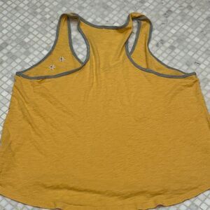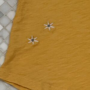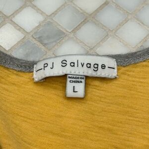 PJ Salvage Yellow Racerback Tank Top with Embroidered Daisies. Scoop neck. Contrasting gray trim around top. Cotton blend.