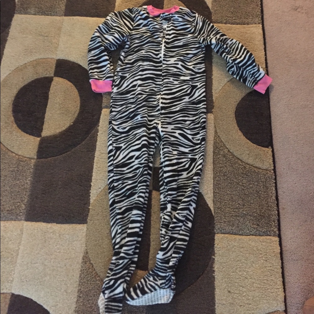 Zebra Print footie PJ for youth girls. With zipper in front. Size small 6/6X. These are great for sleeping. Pink trim on collar and sleeves. Great condition