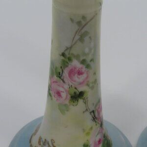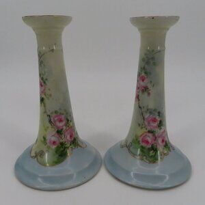 PL Limoges France Hand Painted Pink Rose Flower Floral Blue Gold Candlesticks