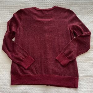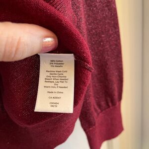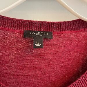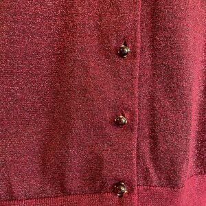 Petite large Talbots red/burgundy metallic long-sleeve cardigan with jeweled buttons. 68% cotton, 21% polyester, 11% metallic. This is in excellent used condition with no stains, rips, tears, pulling, or pilling. Measurements in photos.
