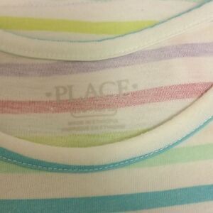 this is a girls size L 10/12 short set. place is the brand. shorts adorned with bow. short sleeved top is multi colored including the colors of neon green, seafoam green, rose pink, purple and white. cute set