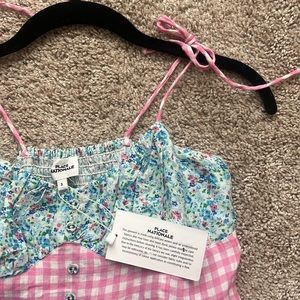 Never worn, new with tags, removable belt, spaghetti string tie straps
