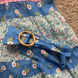 100% linen. Made in India. Hand wash. Unlined. Pull-on styling. Self tie shoulder straps. Detachable waist belt Lightweight linen fabric with floral and colorblock design. PLNE-WD33. SU22-09. Place Nationale is known for