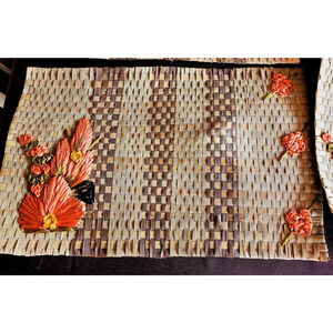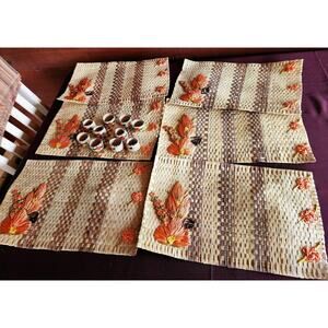 A set of 6 vintage woven Mexican placements and a set of 10 of matching napkin holders. The placements measure 18" x 12". The napkin rings have a diameter 1.5". The woven placements are a natural and brown straw. The flowers are a bright melon/orange color. They are in very good condition for a used woven placement. There are no tags on placements or napkin holders. The ends are curled up a little because of storage. Very cute.