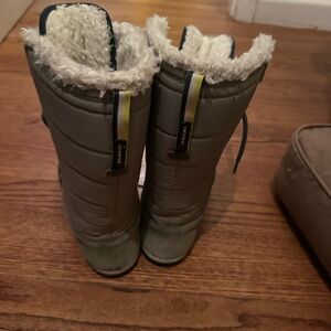Olive green color. Unisex. Stylish and durable kids boots. Green with cozy lining. Ideal for outdoor play. Used but more life.