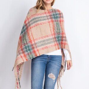 PLAID PRINT FRINGE SWEATER SHAWL PONCHO