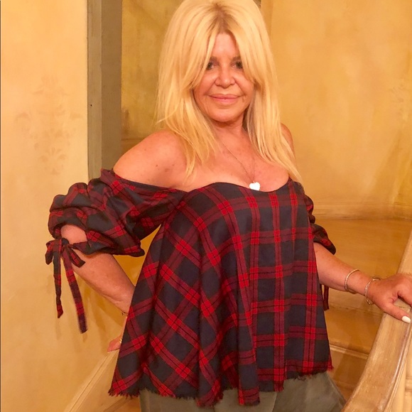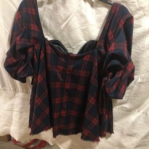 Bustier flare top with fitted underneath bra support.....zip back....full 3/4 with shirred and bow detail . Red and navy plaid.